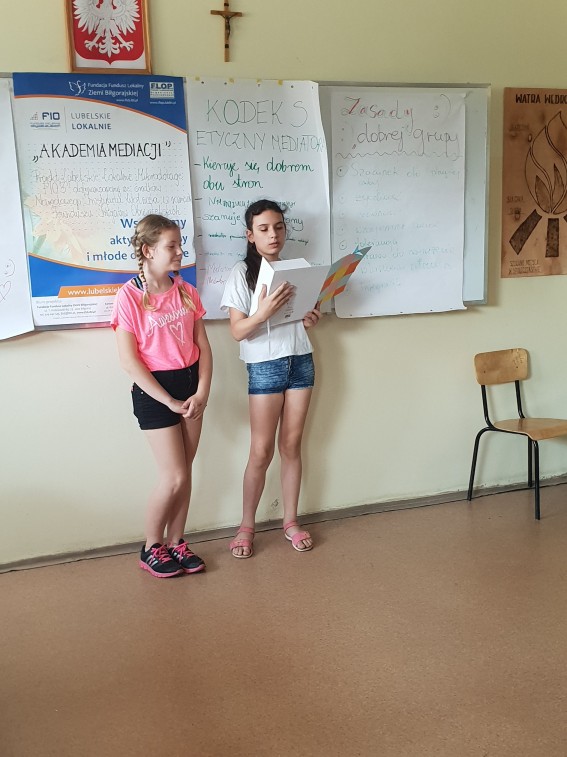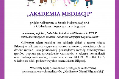 Projekt zakłada przeprowadzenie 20 godzinnych warsztatów edukacyjnych z mediacji rówieśniczych dla dzieci z klas V-VII (chłopcy i dziewczynki – łącznie 10 osób), którzy ukończyli 10 lat ze Szkoły Podstawowej nr 3 z Oddziałami Integracyjnymi w Biłgoraju, dzięki którym zdobędą wiedzę oraz umiejętności w zakresie polubownego rozwiązywania problemów, sporów w środowisku szkolnych. W ramach prowadzonych warsztatów zostanie utworzony KLUB MEDIATORA zgodnie ze standardami mediacji rówieśniczej i szkolnej w szkołach i innych placówkach oświatowych Rzecznika Praw Dziecka z listopada 2017 r. Klub będzie skupiał wyszkolonych mediatorów rówieśniczych mających autorytet uczniów i nauczycieli w szkole, którzy będą pomagać swoim kolegom oraz koleżankom w rozwiązywaniu problemów jako osoby bezstronne w danym konflikcie . Po zakończeniu warsztatów mediatorzy otrzymają dyplom (zaświadczenie) MEDIATORA RÓWIEŚNICZEGO.