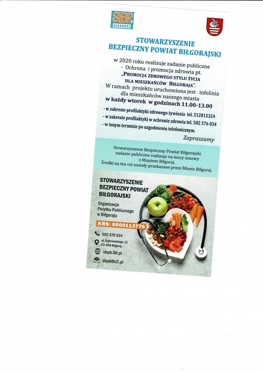Trwa realizacja projektu ze środków Urzędu Miasta Biłgoraj na 2020rok do dnia 15 września przyjmujemy zapisy na szkolenie i warsztaty w zakresie zdrowego żywienia dla mieszkańców Biłgoraja .Ilość miejsc ograniczona decyduje kolejność zgłoszeń na emeil sbpb@o2.pl osoby zakwalifikowane powiadomimy do 20 września br.Zapraszamy Zdrowia pozdrawiamy Zarząd Komisja Rewizyjna SBPB